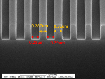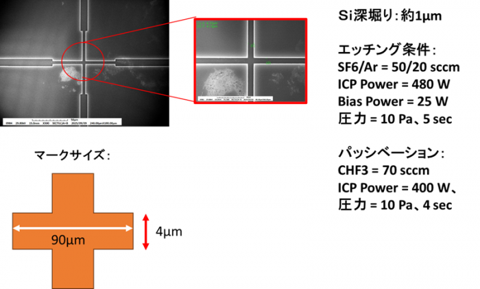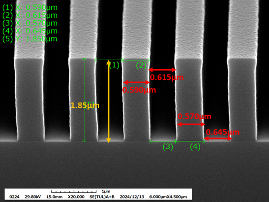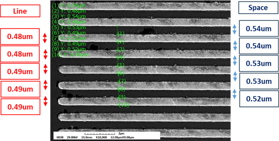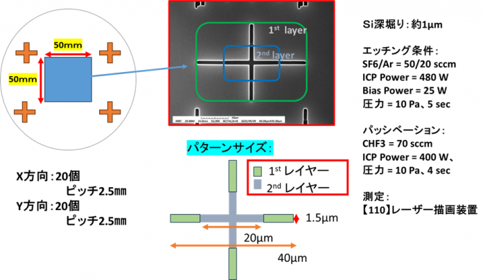 | 仕様 | ・型式:MLA150 ・光源:半導体レーザー(375nm ) ・ステージ位置決め精度:10nm(X軸,Y軸) ・最大ウエハーサイズ:φ8インチ ・最大描画エリア:200mm×200mm ・アドレスグリッド:40nm ・最小描画パターン:500nm(L&Sパターン) ・エッジラフネス:60nm(3σ) ・CD均一性:100nm(3σ) ・重ね合わせ描画精度:0.25μm(5mm×5mm)、 0.5μm(100mm×100mm) ・ 裏面パターンとの重ね合わせ描画精度:1μm |