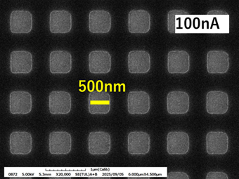 仕様 | 本装置は、レジストを塗布した基板に細く絞った電子ビームを照射し、微細なレジストパターンを形成する装置です。加速電圧が 50 kVであり、最小描画線幅は20nmです。大電流かつ狭ピッチでの描画が可能となり、より高速で高品質な描画を実現します。 ・型式: ELS-BOEDEN50 ・ 試料ホルダーの種類 ・8 インチ ・マルチウェハ(ピンの位置設定で変更) ・小片 ・10mmΦ 最大試料サイズは、8インチ。 ・電子銃: ZrO/W熱電界放射型 ・加速電圧: 50kV ・最小ビーム径: 2.8 nm ・最大スキャンクロック: 100 MHz ・ショットピッチ: 1 nm ・ビーム電流強度: 1nA~800nA ・フィールドサイズ: 1000μm□、100μm□ 、250μm□、500μm□、1500μm□ ・つなぎ精度: □1000µm フィールド …±30nm 以内 ・重ねあわせ精度:±30nm ・描画可能エリア: 210 mm x 210 mm ・ソフトウェア elms ビーム調整機能、描画スケジュール機能、パターンデータ変換機能 オーバーヘッドタイムを省いた「高速モード」あり |